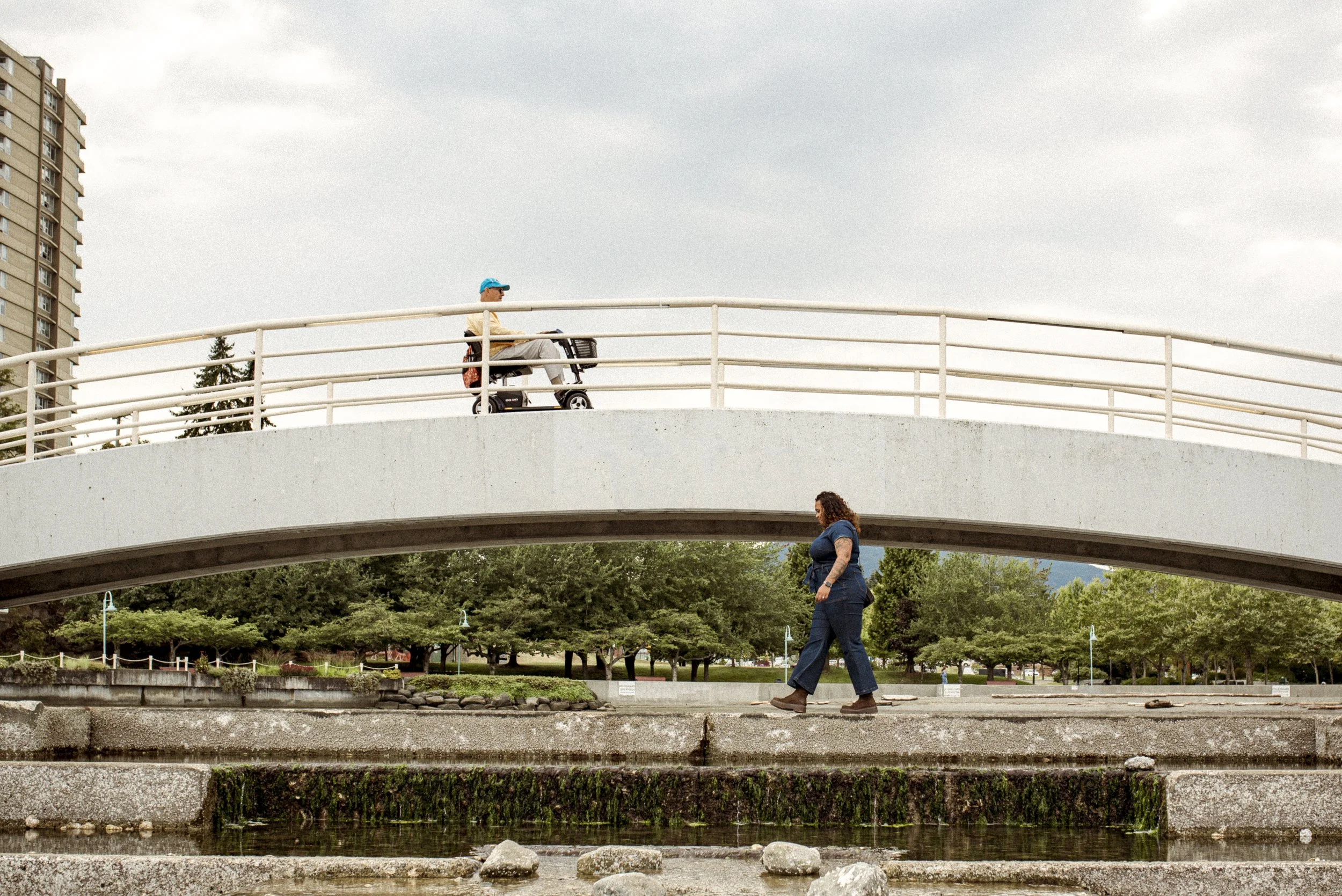 Image description: a man in a scooter going over a white bridge while a woman walks along the path below.