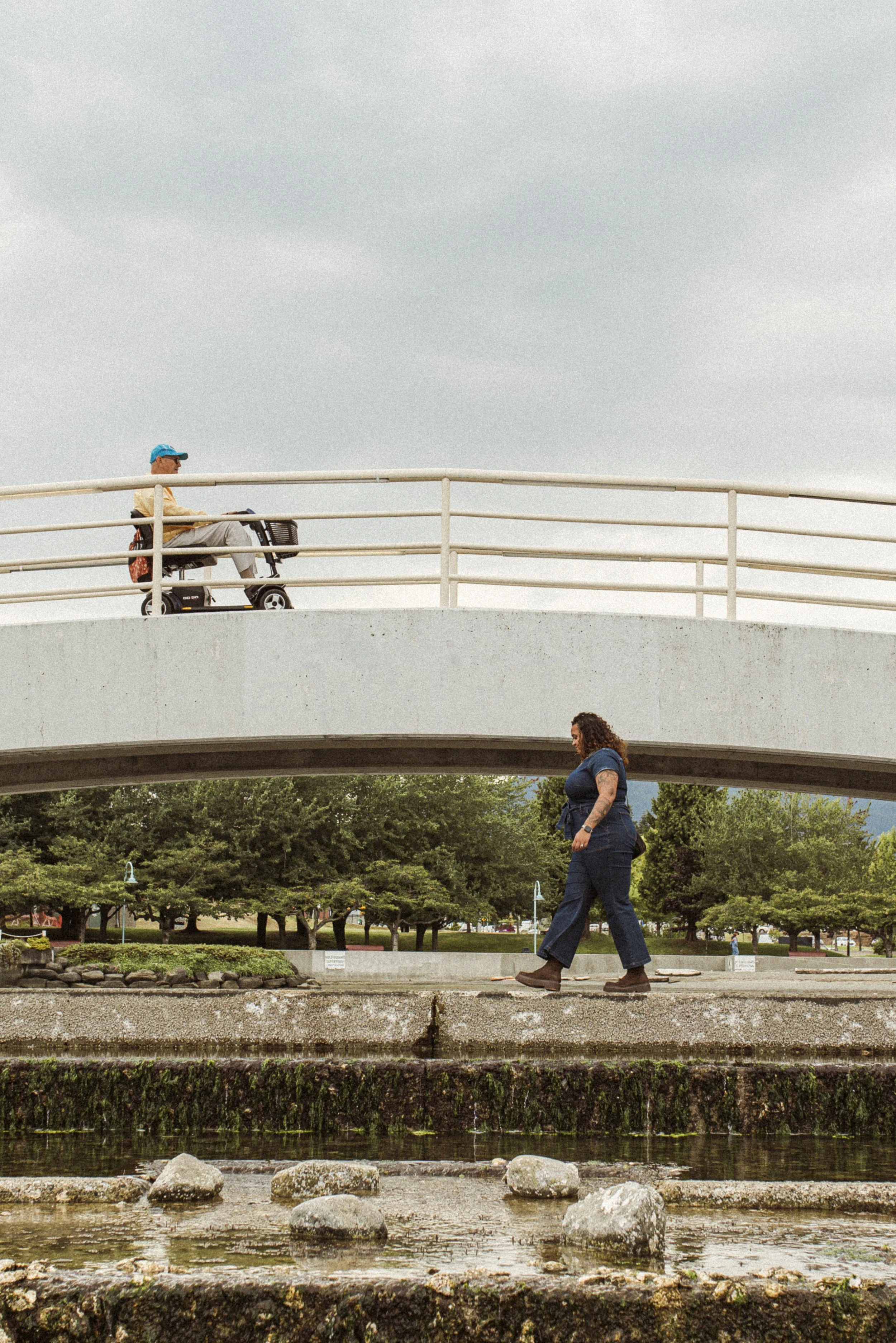 Image description: a man using a scooter going over a white bridge while a woman walks along the path below. Image created with the lovely folks at Tourism Nanaimo.